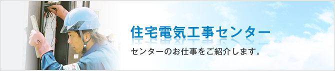 住宅電気工事センター 住宅電気工事センター住宅電気工事センターの主な業務を紹介しています。 お客さま満足度調査お客さま満足度向上をめざして、アンケートを実施しております。 住宅電気工事センター検索お近くの住宅電気工事センターの検索にとても便利です。